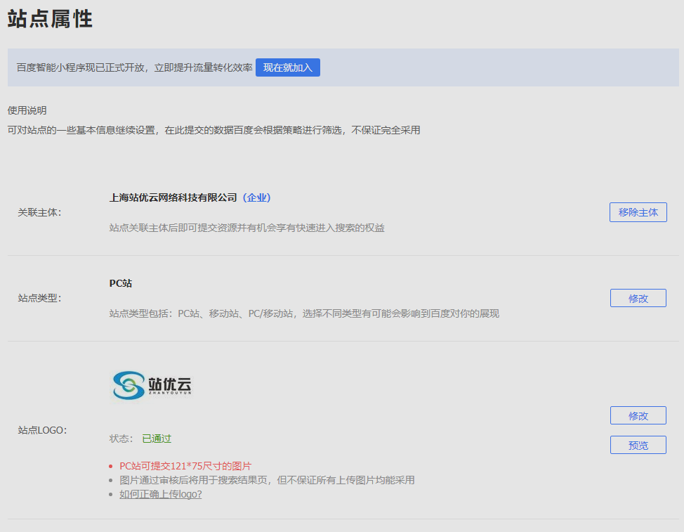 首先在百度站长平台中的站点属性中提交站点logo图片,大小是121*75或者75*75。如图所示: