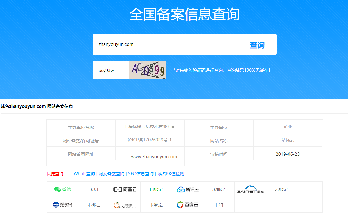 通过此工具查询结果中,我们可以从图中看出我们站优云的备案渠道是阿里云备案,这个功能就是其他查备案渠道所不具备的,其独有的功能.
