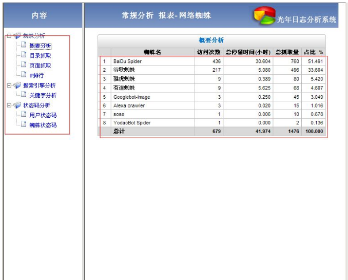 光年日志分析工具和iislog日志分析工具iis网站日志分析工具光年日志分析工具在分析的数据上做得更加细化,概要分析处可以看到各搜索引擎蜘蛛来访次数 、总停留时间(小时) 、总抓取量 以及占比的百分比。还能看到蜘蛛抓取了你网站的哪些目录以及页面,并且给了各搜索引擎蜘蛛IP抓取量一个排行,可以让你对来访蜘蛛更加了解,方便针对各搜索引擎做seo调整。