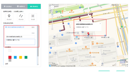 三:来到第三栏目,也是最关键的一个栏目设置,因为前两步只是在地图上找到企业的位置,但是地图上内容很多,很难让人一眼就能找出公司位置,这时就需要对地图上的公司位置进行标注了。