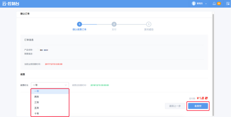 2.先根据需要选择“续费时长”,再点击“去支付”