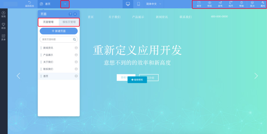 3.设计界面还包括页面及模板页的设置,PC及手机端的切换,预览,发布,保存等按钮