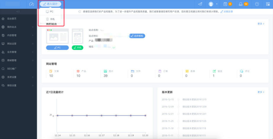 1.点击“进入设计”,即可进入网站设计页面(分为PC端及手机端,需要分别设计)