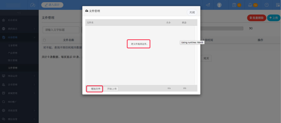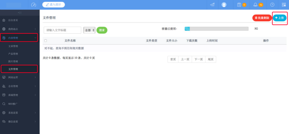 1:登录网站管理后台,点击“内容管理”—“文件管理”—“上传”