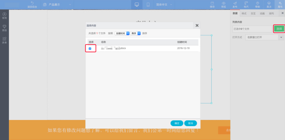 4.点击文件列表或者小扳手“设置”—-右侧出现属性栏—“数据”—点击“选择”,勾选需要的文件即可