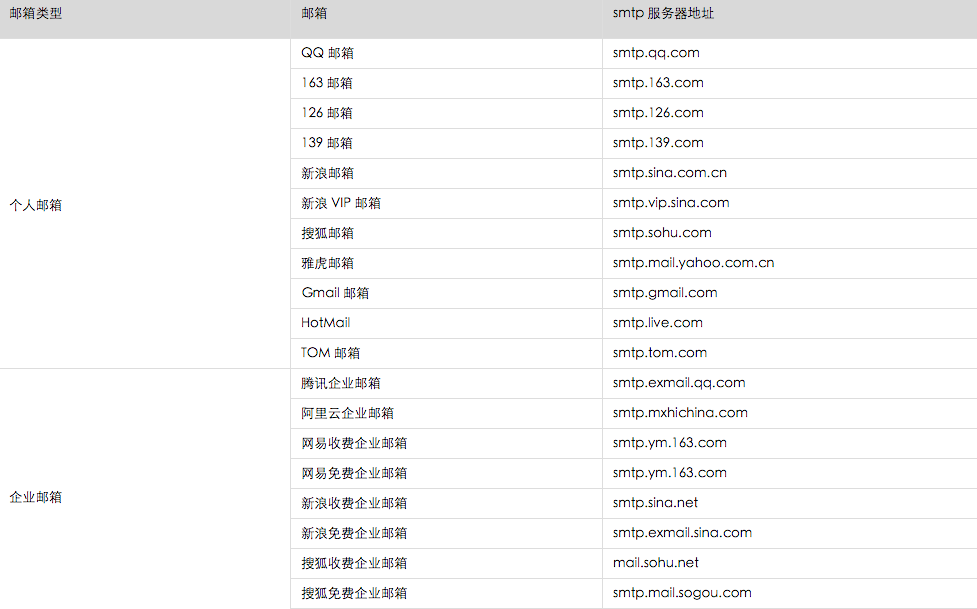 常用邮件服务器地址温馨提示:您需要开启邮箱的SMTP协议才能使用该功能。通常在您邮箱的设置菜单可以进行开启SMTP协议的设置。部分主流邮箱服务器地址如下,如果您的邮箱非以下邮箱的任何一个,可在您邮箱的帮助页面查看或咨询邮件服务提供商。 赏邮箱服务器配置