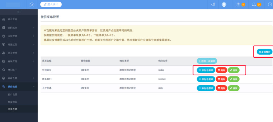 11:菜单设置:可以对微信菜单进行增加、删除、编辑等操作。同时,此功能还可对用户点击菜单时做出响应详细操作设置,添加之后直接点击“同步到微信”即可