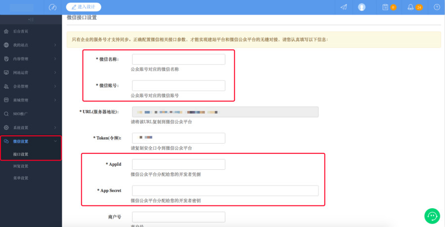 1)进入微信设置—接口设置,复制URL服务器地址及Token(令牌)信息