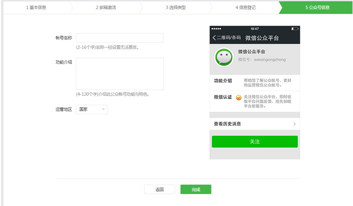 5.进行信息登记填写,之后点击继续完成验证,并填写公众账号信息,完成注册