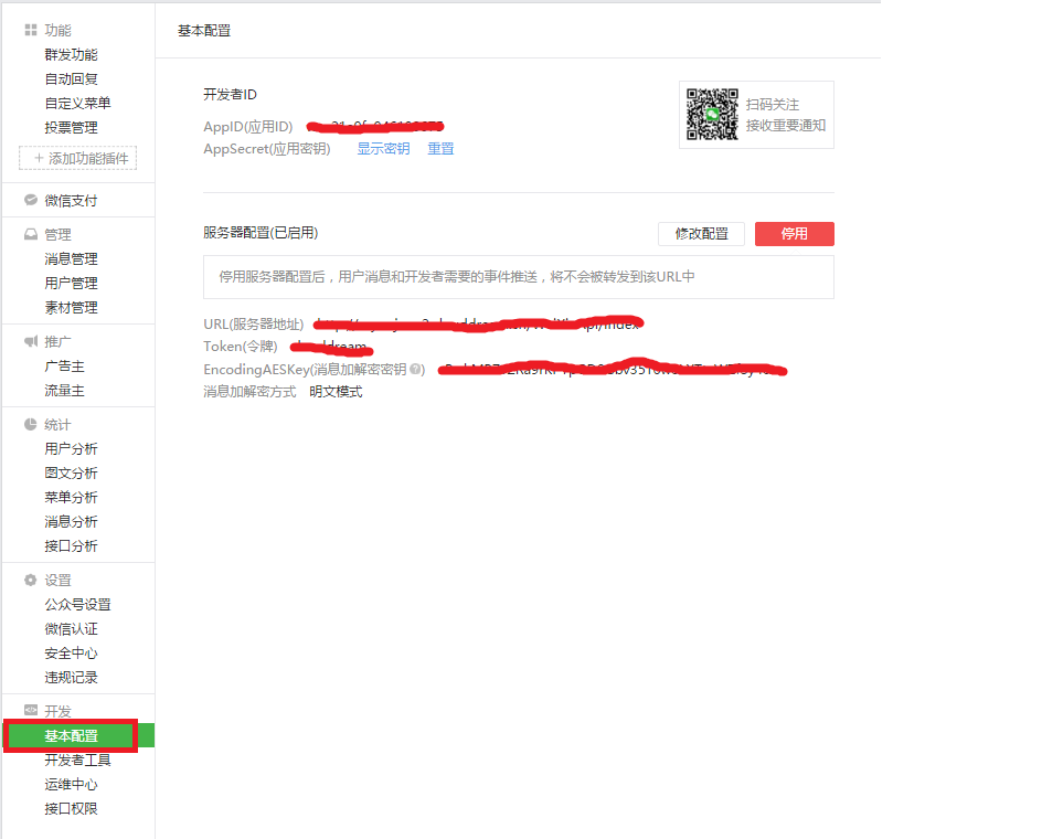2)添加至 微信后台 URL(服务器地址) 和Token(令牌),EnoodIngAESKey(消息加解密密钥) 点击随机生成即可,“消息加解密方式”选择兼容模式,保存即可,微信后台设置成功。
