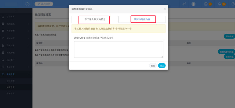 11.支持“手工输入回复的消息”和“从网站选择内容”两种方式,进行自动回复。