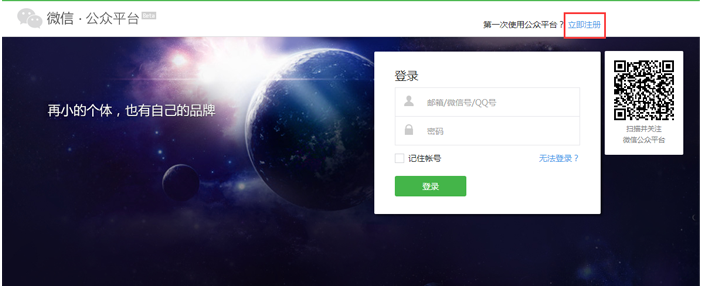 1.登陆微信公众平台(https://mp.weixin.qq.com),点击立即注册