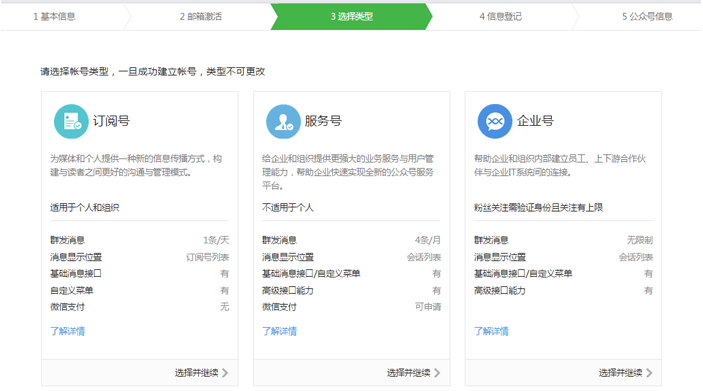 4.选择公众账号类型:根据网站类型进行选择