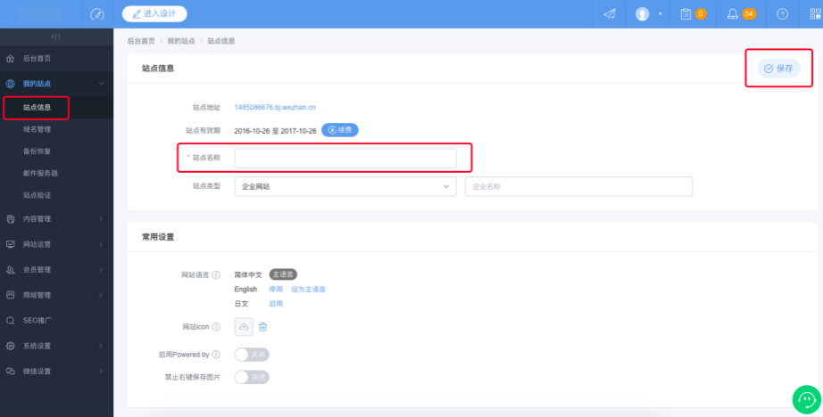 1:登陆网站后台,点左侧我的站点—站点信息—修改站点名称—保存即可