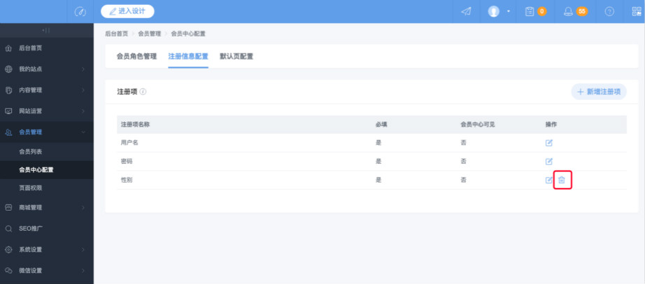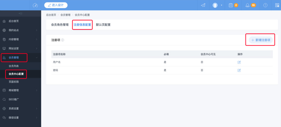 3.进入注册信息配置,用户名和密码是默认的注册项,点击“新增注册项”,即可增加用户在注册时,需要填的选项