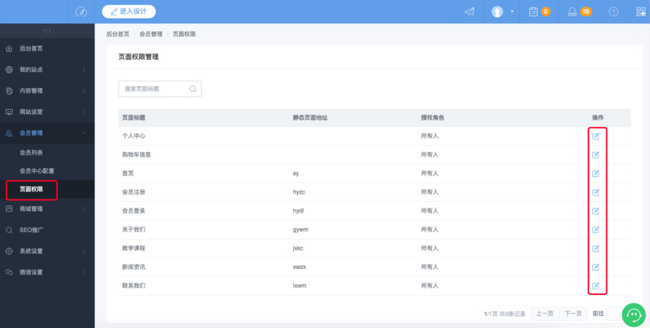 5.进入页面权限,点击各个页面后的“编辑”,即可此编辑页面的权限