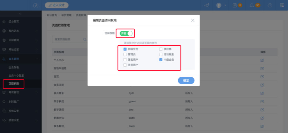 6.开启访问权限,选择此页面允许访问的角色,确定即可