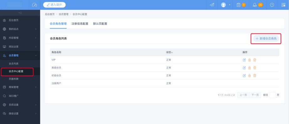 1:登陆网站后台,点击会员管理—会员中心配置—会员角色管理,点击“新增会员角色”,可以添加会员的等级