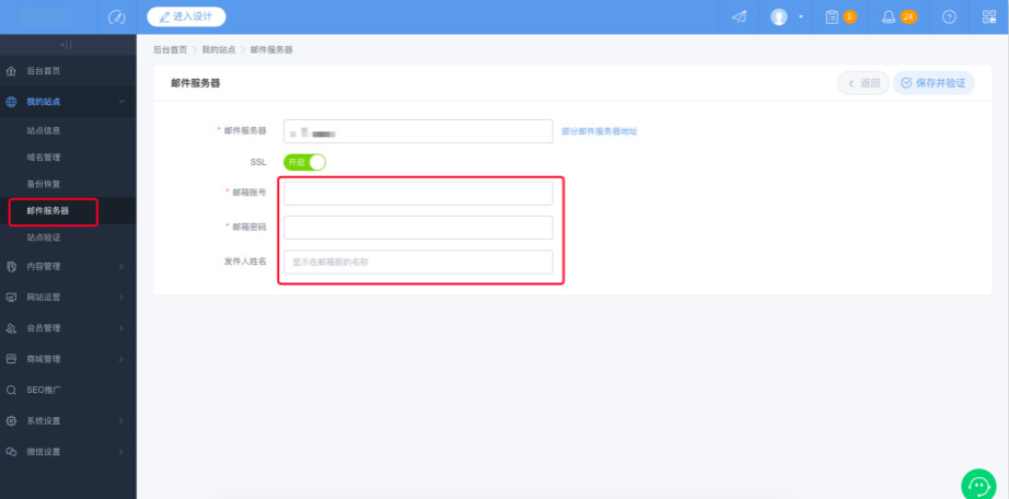 1:登录后台,进入我的站点—邮件服务器,填写邮件服务器地址,可点击“部分邮件服务器地址”,获取需要的地址,并“开启”SSL。