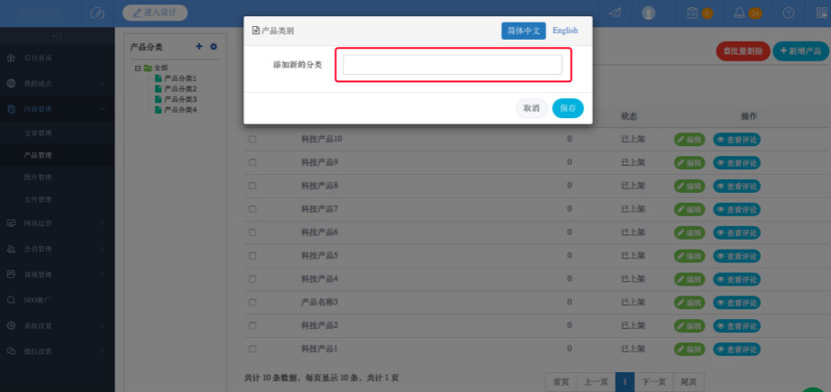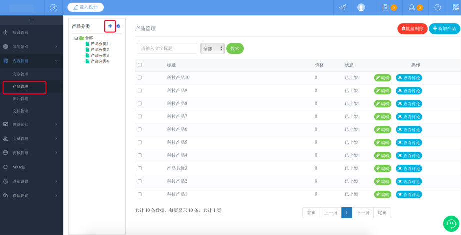 首先要对产品进行分类,点击“内容管理”—“产品管理”—“产品分类”旁的“+”,来增加产品分类