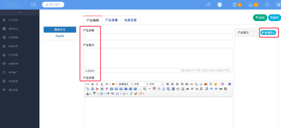 4.添加产品的名称、简介、详情、图片后,点击保存,产品就添加好了。