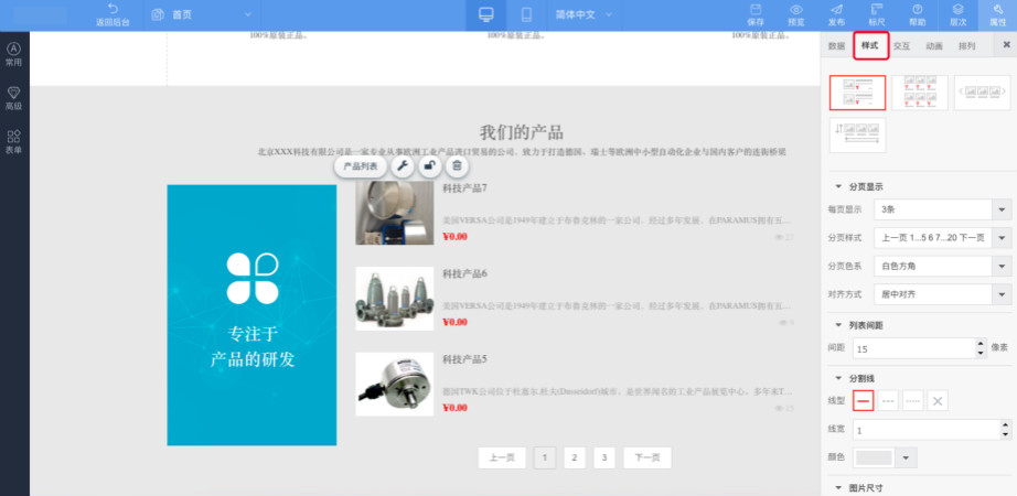 7.在属性栏“样式”里设置产品列表的样式、显示方式等