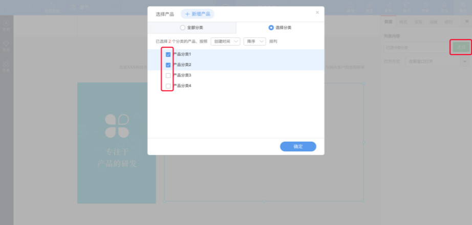 6.点击文章列表控件或者小扳手“设置”—右侧出现属性栏–点击“数据”—选择要调用的产品分类即可。