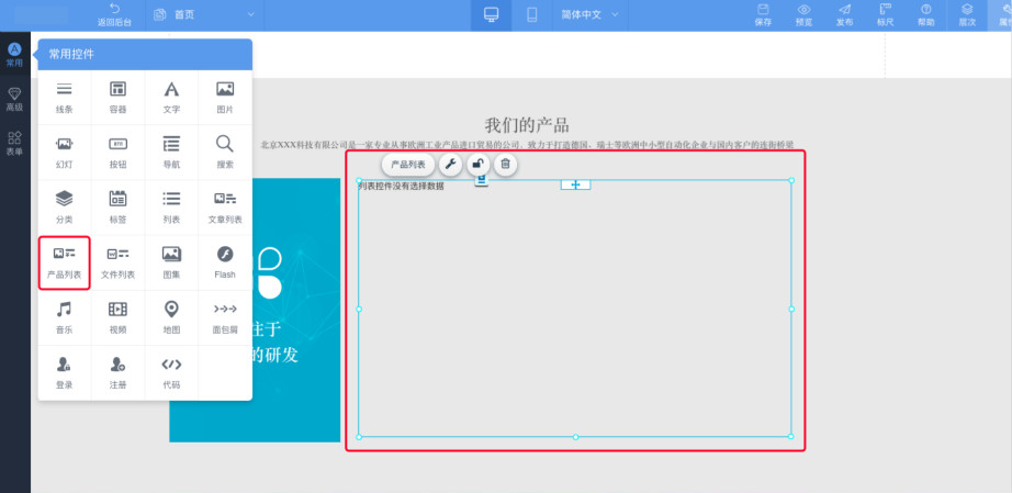 5.进入到设计页面,常用控件—产品列表控件,在页面上画框,即可添加一个产品列表。