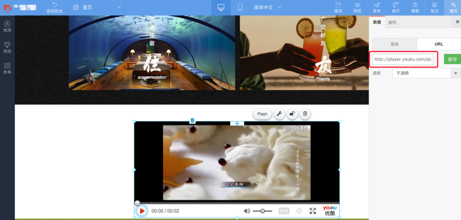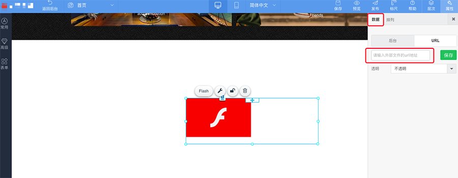 2:点击“flash控件”或者小扳手“设置”,右侧出现属性栏,选择“URL”输入视频地址