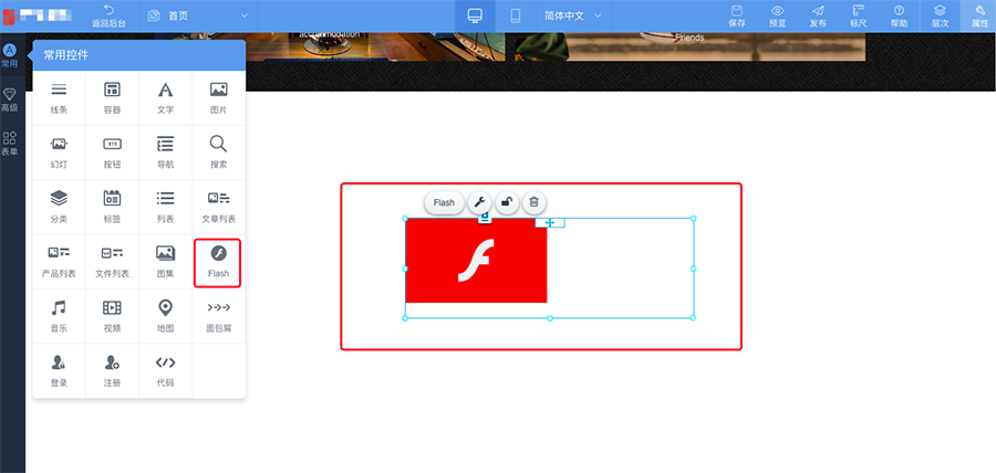 1:点击左侧“常用控件”—“flash控件”,在页面上画框,即可添加一个flash控件