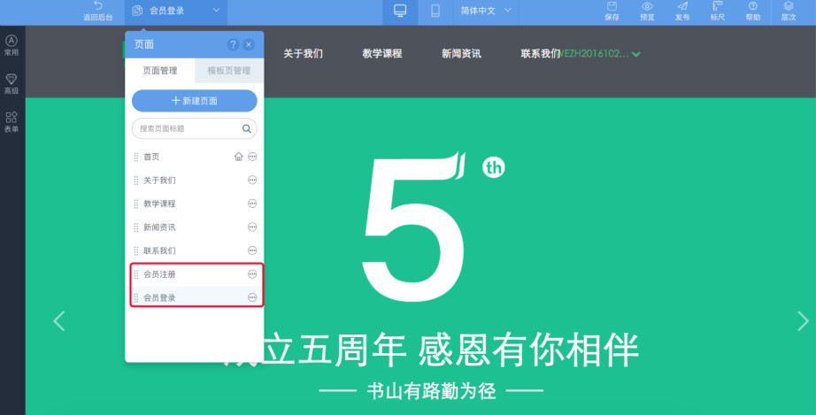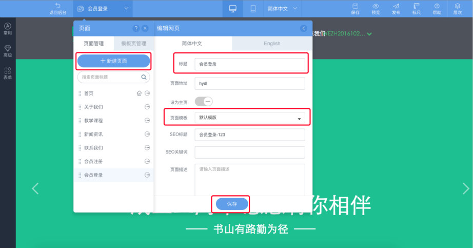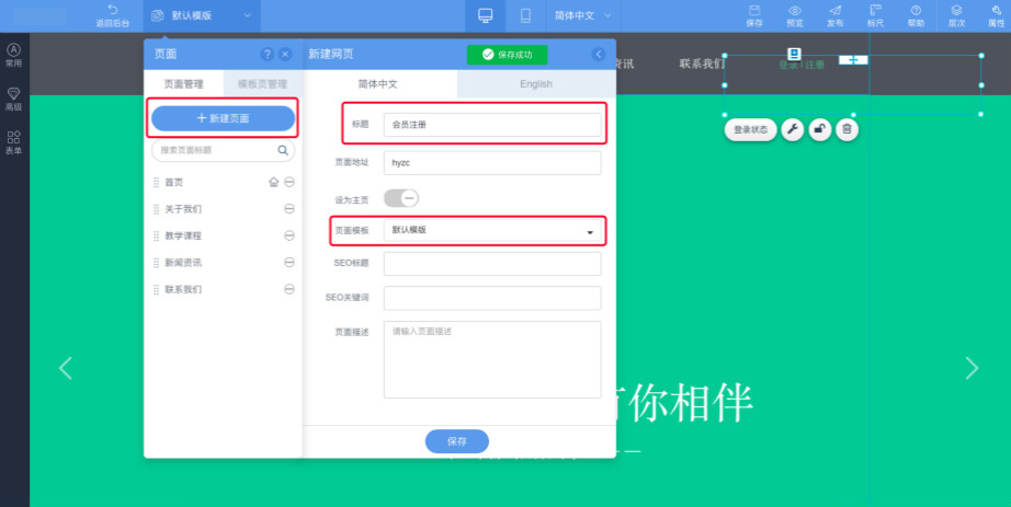 1.首先需要新建一个注册页面以及一个登录页面,点击“新建页面”,输入页面标题、选择需要的模板即可