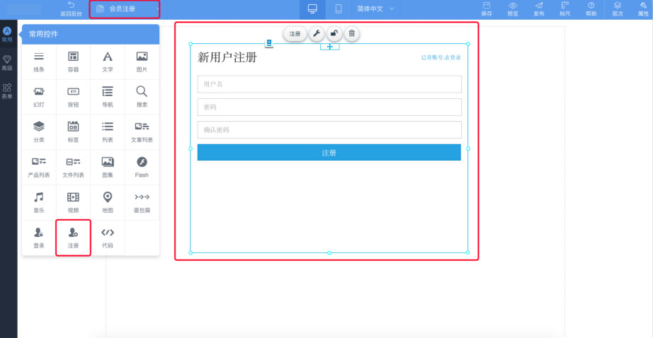 2.首先切换到注册页面进行编辑,进入页面管理—注册页面,选择左侧常用控件—点击注册控件—在需要添加的位置画框,即可添加一个“注册控件”
