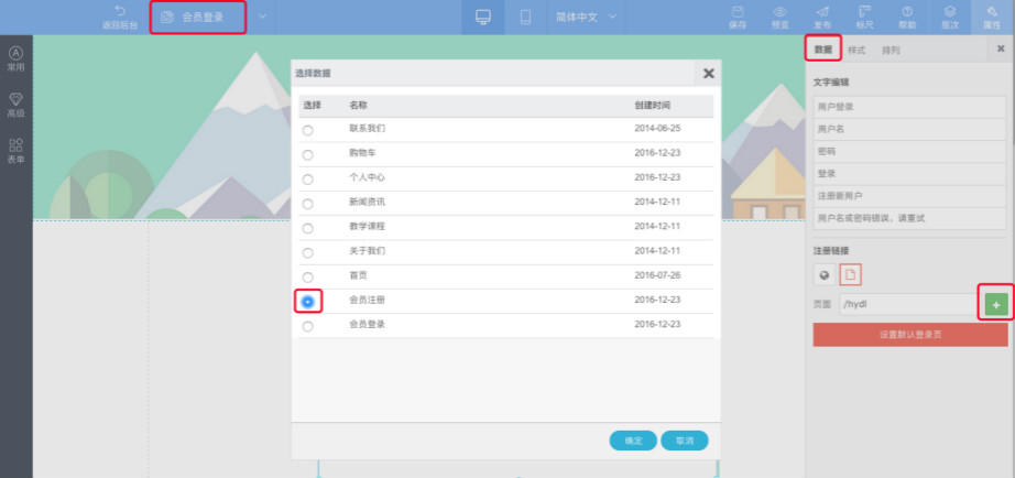 6.点击控件或者小扳手“设置”—数据—设置登录框字段和文字,点击“+”按钮,勾选注册页面,保存即可。