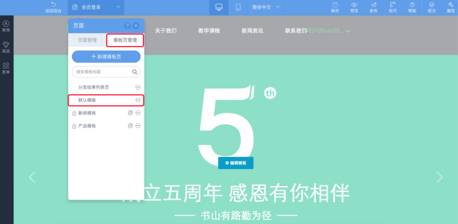 8.登录和注册页面设置好后,切换到模板页管理—默认模板