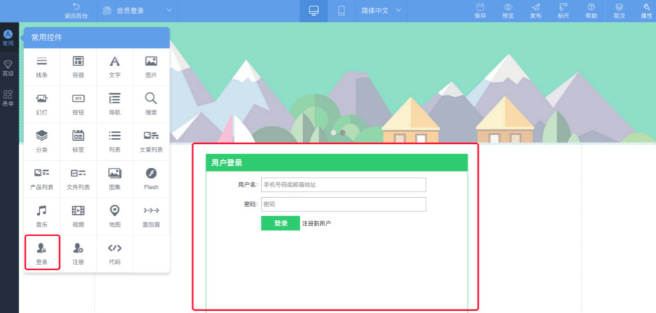 5:注册页面设置好后,接着设置登录页面,首先切换到登录页面,选择高级—点击登录控件—在需要的地方画框,即可添加一个登录控件