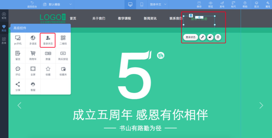 9.在默认模板里,点击高级控件—登录状态控件,在需要的地方画框,即可添加控件