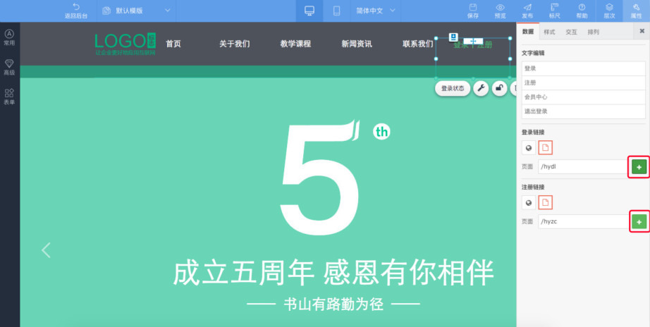 3.点击注册控件或者小扳手“设置”—右侧出现属性栏—数据—编辑注册的字段及文字,点击“+”号,勾选登录页面——保存即可。