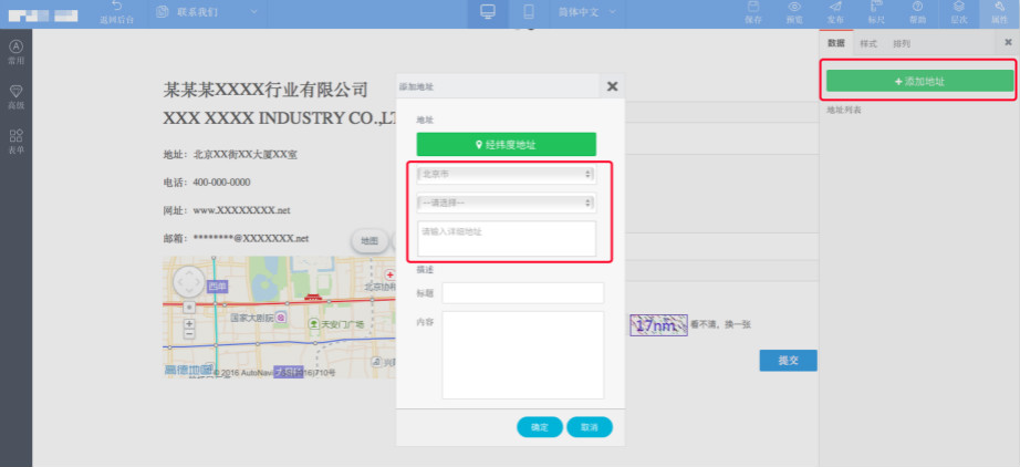 地图控件1:打开要添加地图的页面,以“联系我们”页面为例,如下图所示2:点击常用控件—地图控件—在需要添加地图位置画框,地图控件就添加成功了3.点击地图控件或者小扳手“设置”,右侧出现属性栏,选择“数据”—点击“添加地址”,输入地址并确定即可 赏常用控件