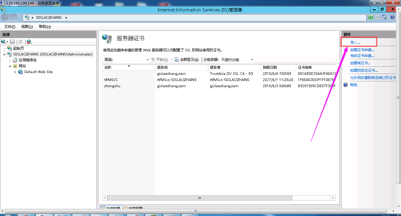 ~安装完成后,在web服务器中进行证书导入操作。“服务器证书”—“导入”即可成功在云服务器端安装证书。如下图: