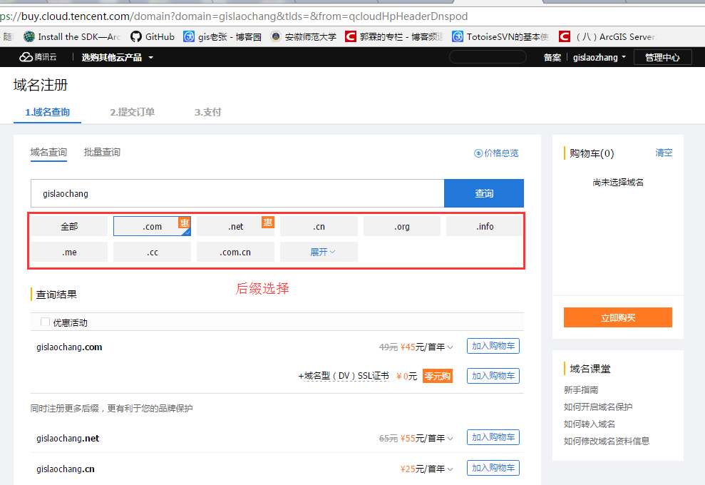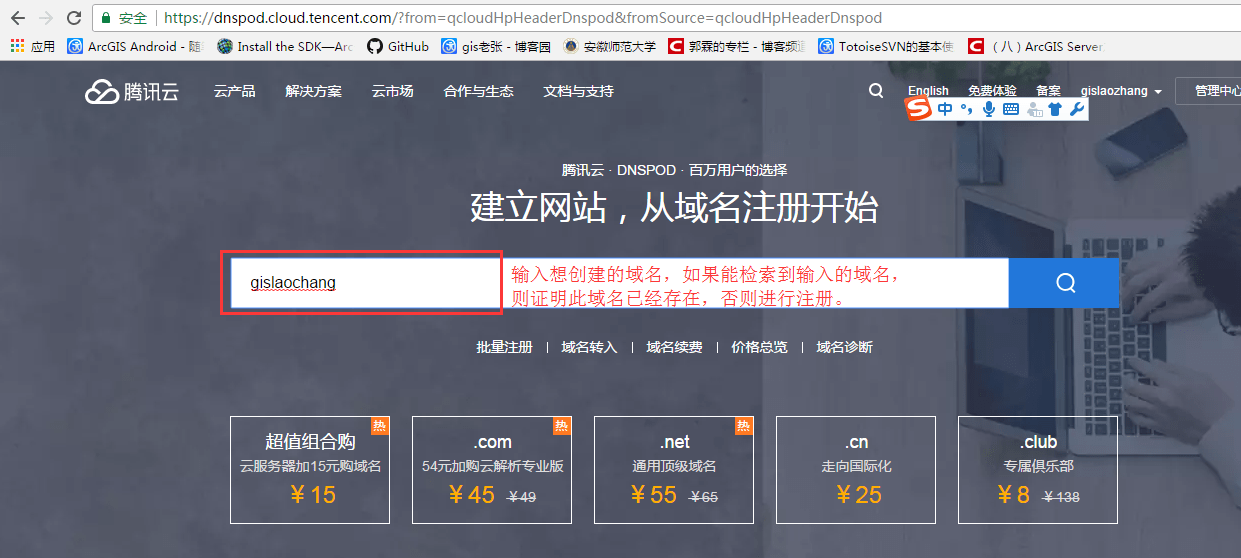 a、腾讯云官网菜单栏“云产品”—-“域名服务”—-“域名注册”,然后在弹出的输入框输入想要注册的域名检索是否已被别人注册;如果没有,则可以进行注册,如下图: