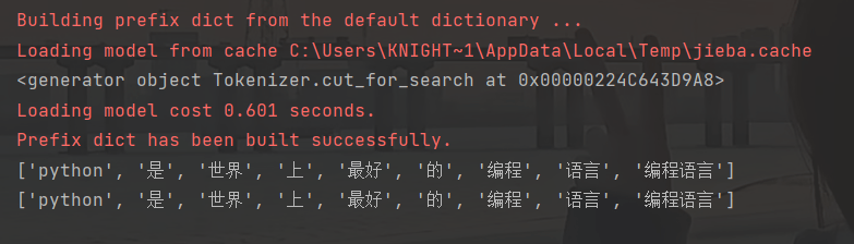 return list(self.cut(*args, **kwargs))查看jieba模块,其定义lcut()函数如上,可以发现lcut()函数最终返回的是list(cut())