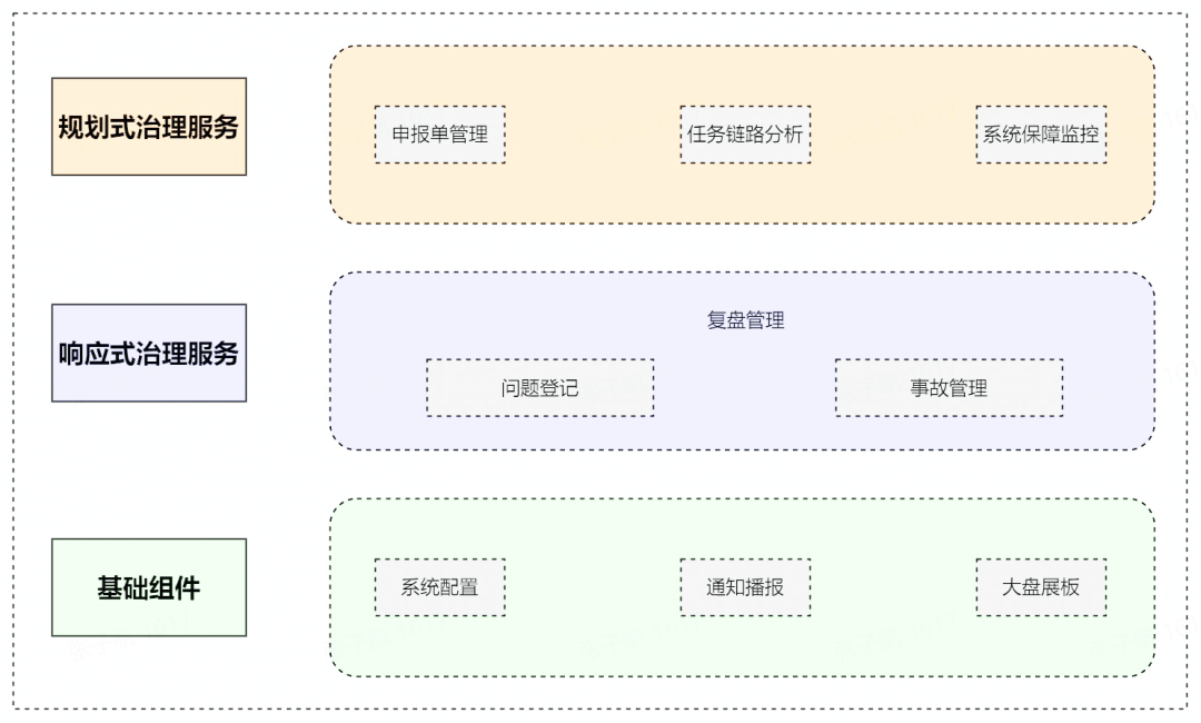 平台整体主要分为基础组件、规划式治理服务、响应式治理服务三大块,系统组件架构图如下: