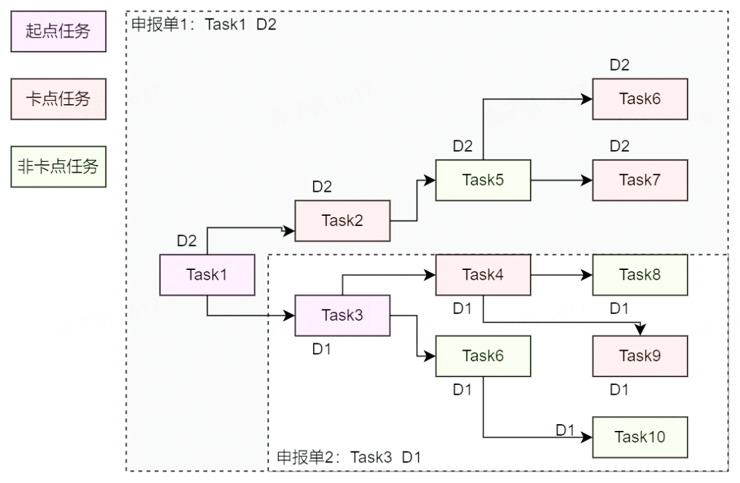 一个申报单会关联多个任务(即该申报任务及其上游的卡点任务),同理一个任务也会关联多个申报单,因为在一个 DAG 中,申报任务可能从任意节点起,因此二者是