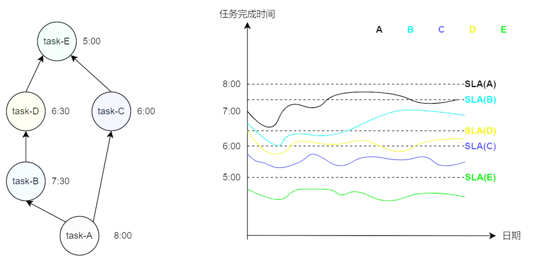 理想的一组任务的完成时间与对应 SLA 之间的关系如下图所示,即各个任务及其上游任务都在对应的 SLA 之前完成,这也是平台的治理目标。