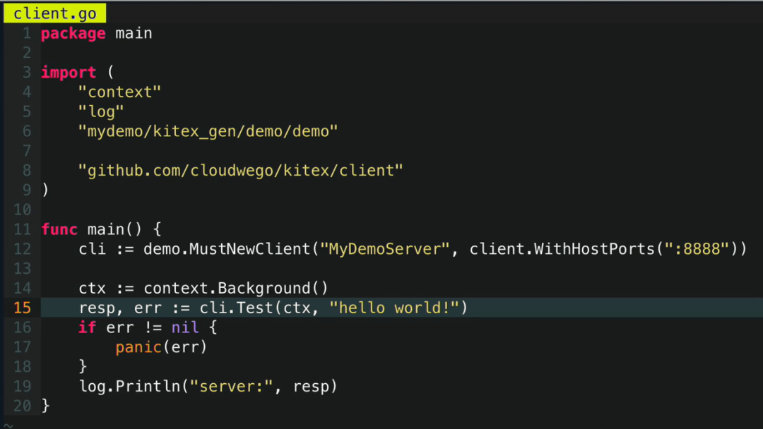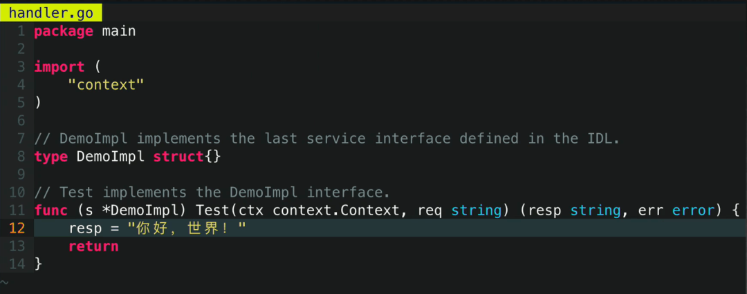 随后,我们需要填充业务逻辑。文件中除了第 12 行,全部代码都是 Kitex 命令行工具生成的。通常一个 RPC 方法需要返回一个