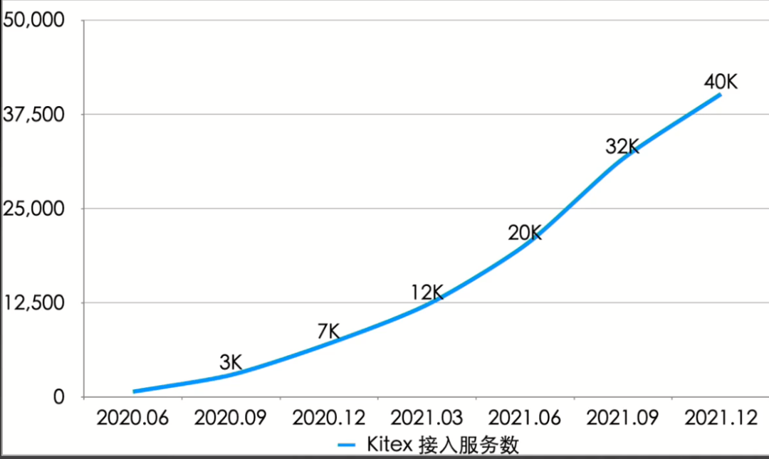 1000。随后进入快速发展的阶段,到 2021 年年初,累积接近 1w+ 的服务开始使用 Kitex。2021 年底,4w+服务使用 Kitex。