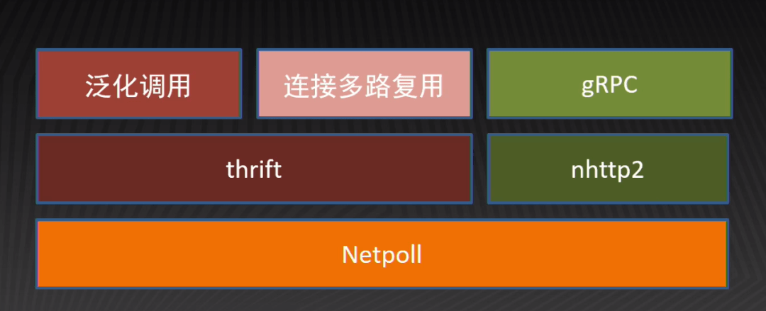 Kitex 网络层基于高性能网络库 Netpoll 实现。在 Netpoll 上,我们构建了 Thrift 和 netpoll-http2;在