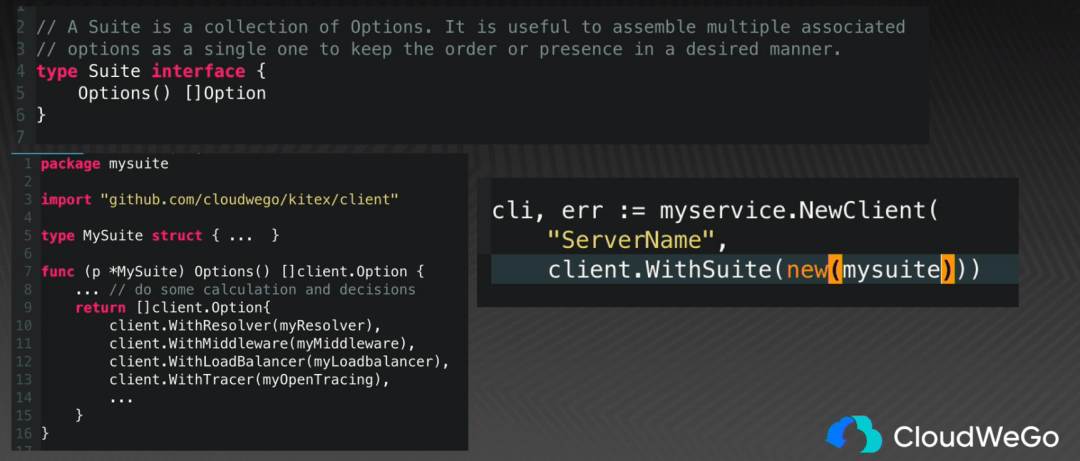 Kitex 的一个创新之处是使用 Suite 来打包自定义的功能,提供一键配置基础依赖的体验。