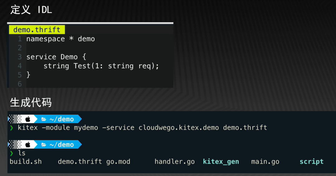 String,它的返回也是 String。编写完这个 demo.thrift 文件之后,就可以使用 Kitex 在命令行生成指定的生成代码。如图所示,只需要传入