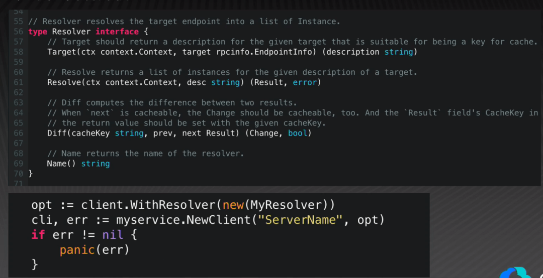 以服务发现为例,Kitex 的核心库里定义了一个 Resolver interface